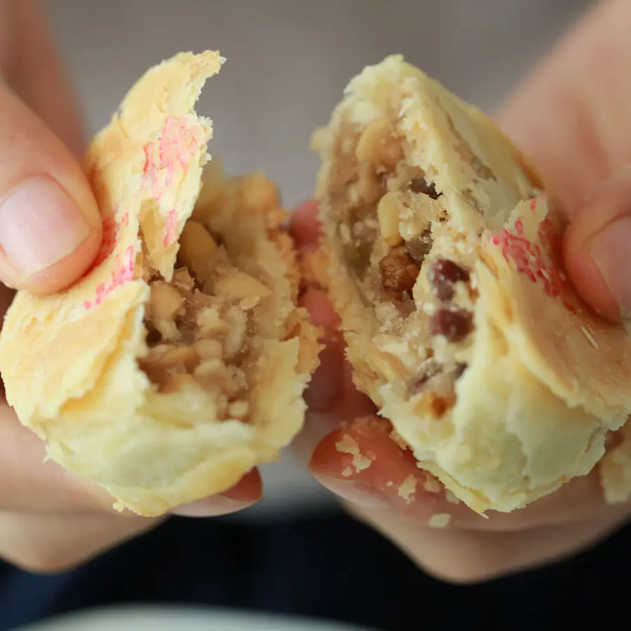 颜师傅对月饼的评判标准堪称苛刻,面团反复揉捏,烤完后酥皮层层叠叠可达10层以上,每一层都薄如纸、脆如瓷;馅子必须真材实料,大颗的杏仁,完整的核桃仁、松子仁,其中贵的橄榄仁,一斤就要几百块钱。
